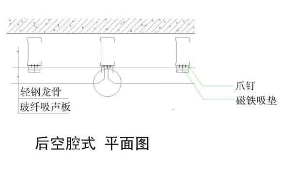 采用輕鋼龍骨滿刷、玻纖吸聲板上對(duì)應(yīng)輕鋼龍骨部分滿刷粘接劑方式固定連接。必要時(shí)可選擇采用配套配件(抓釘和磁鐵吸墊),以增加粘接的牢固性。